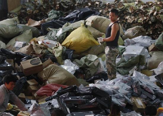 11月11日,杭州一家快递公司,汹涌而来的快件堆成了山。双十一网购节,突然激增的网购量,造成各大快递公司忙得不可开交。