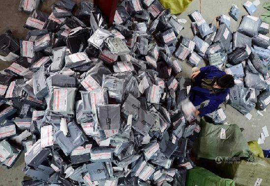 11月12日凌晨,阿里巴巴公布“双十一”全天交易数据:天猫双十一全天成交金额为571亿元,其中在移动端交易额达到243亿元,物流订单2.78亿。11月11日,江西九江,一家快递分拣中心,工作人员正在分拣快件。胡国林 摄