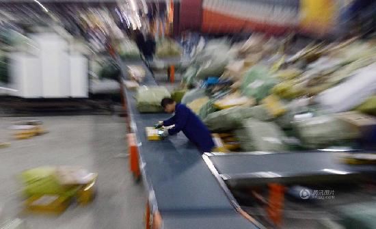 根据国家邮政局的保守预计,双十一期间,从今年11月10日到11月17日7天时间,快件总量将突破5亿件,比去年同期增长近五成,最高的日处理量将达到9000万件,比去年同期增长38.5%。图为11月11日,江西九江,一家申通快递分拣中心,工作人员正在加紧分拣快件。胡国林 摄