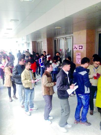 11日上午,济南皇亭体育馆考研报名确认处已经排起了长队。2015年考研现场确认,除了报考济南六所高校的考生,其他两万多名考生均要到济南市招生办确认点进行信息确认。记者看到,等待信息确认的队伍中,一群往届生正围在工作人员周围。