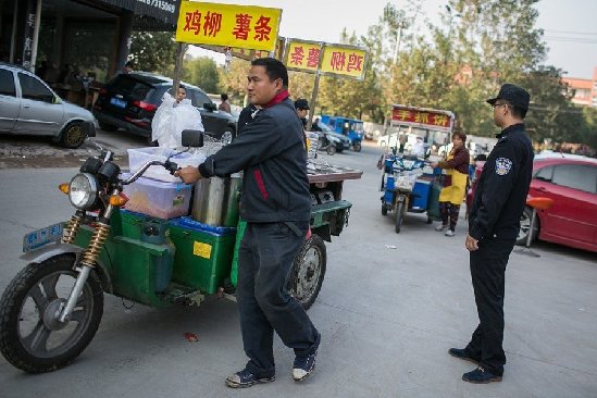 吕敏翔(右)引导流动摊贩退回到规定区域内经营。