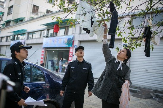 吕敏翔(中)和城管执法人员劝说一位市民把晾挂在沿街树上的衣物收下来。