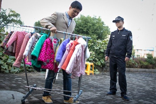 吕敏翔(右)劝说一位市民把在街面随意晾晒的衣物收走。
