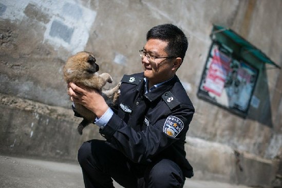 吕敏翔抱起一只收捕到的无证小狗放入笼中,有点不忍心将它送去集中收容中心。