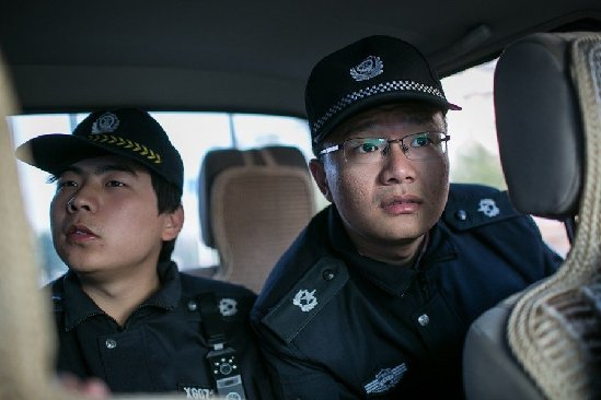 吕敏翔(右)坐在执法巡逻车里,仔细查找沿途违反街面秩序和市容环境规定的现象。