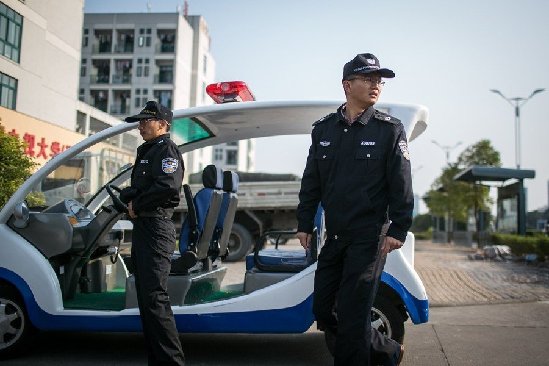 吕敏翔(右)和城管执法人员巡查街面秩序问题。