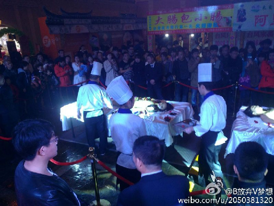 2014年11月11日,光棍节这一天,商家炒作极尽能事,在长春新天地三楼惊现一场“女体盛宴”。现场两名女子赤裸着躺在餐桌上,身上摆放着食物,除了厨师可以接触女子外,围观的群众被拦在的围栏外,只可远观。图片来自网友微博