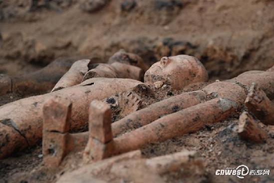 不过在元凤元年,鄂邑长公主却卷入两位托孤大臣——上官桀和霍光的政斗中。因为霍光不给他的情夫丁外人封侯,让守寡的长公主无法再婚,从而招致了她的不满,并迅速的站到了上官桀的一边。后来霍光取得了这场政斗的胜利,鄂邑长公主被迫自杀。可能是因为念及骨肉亲情和养育之恩吧,汉昭帝赦免了鄂邑长公主之子“信”,并对其进行厚葬。图为主墓室边箱陶俑出土现场。