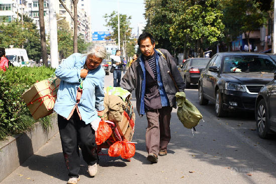 可怜天下父母心,爹妈再苦,都不会苦孩子。安徽省涡阳县一对流浪夫妇一路乞讨到黄石,讨来一蛇皮袋硬币,去银行兑换成整钱后,他们第一时间把钱打给了还在读书的孩子。图为夫妇拖着自己的全部家当在马路上行走。(黄石日报 周巍/CFP)