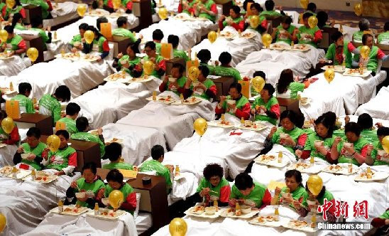 11月12日,共有388人次同时参与在上海浦东一酒店举行的“最多人在床上用早餐”活动,并创造了新的吉尼斯世界纪录。此前,该项目的世界纪录是由妇女健康协会的288位成员于2012年3月12日在澳大利亚成功创下。 中新社发 汤彦俊 摄