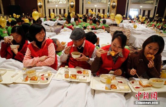 11月12日,共有388人次同时参与在上海浦东一酒店举行的“最多人在床上用早餐”活动,并创造了新的吉尼斯世界纪录。中新社发 汤彦俊 摄