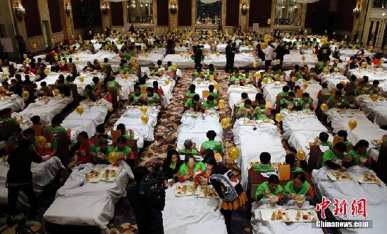 11月12日,共有388人次同时参与在上海浦东一酒店举行的“最多人在床上用早餐”活动,并创造了新的吉尼斯世界纪录。 中新社发 汤彦俊 摄