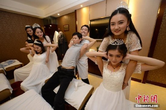 湖南十大校花集体学按摩 倡健康养身方式