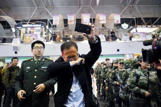 2014年11月14日,北京,首都国际机场,中国人民解放军医疗队伍成员家属洒泪告别亲人。