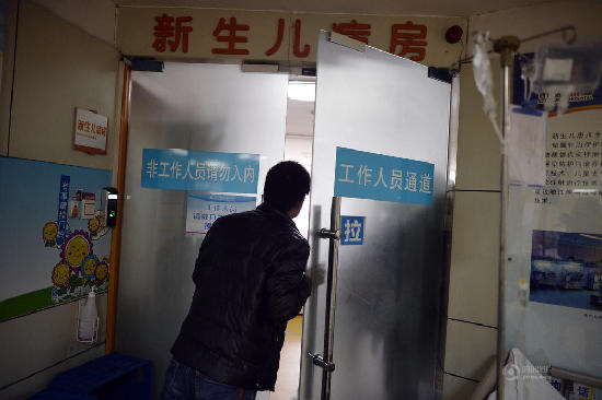 西南医院儿科教授何念海说,如果在两周内,婴儿身体不出问题,就没生命危险了。图为孩子父亲在新生儿病房外苦等孩子出院。