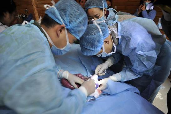 将外露的肠子消毒缝合完后,兽医将其装回大熊猫体内。澎湃新闻 邓建新 图