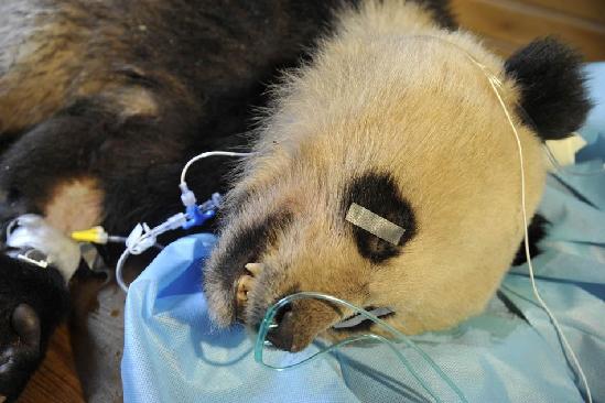手术结束,麻药效果还没退去,熊猫还在昏迷中。澎湃新闻 邓建新 图