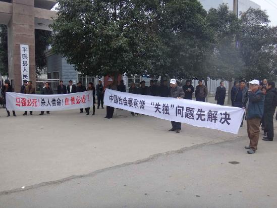 来自全国各地失独家庭代表来到平舆县法院门前呐喊要求法院客观公正审判杀人凶手。