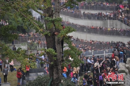 11月20日,重庆一市民为占据有利位置,爬上银杏树观看自己喜欢的明星。陈超 摄