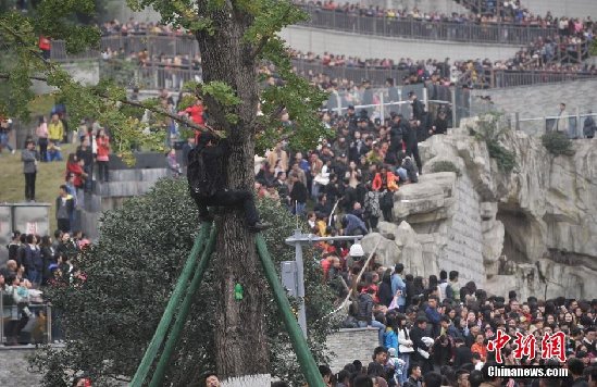11月20日,重庆一市民为占据有利位置,爬上银杏树观看自己喜欢的明星。陈超 摄