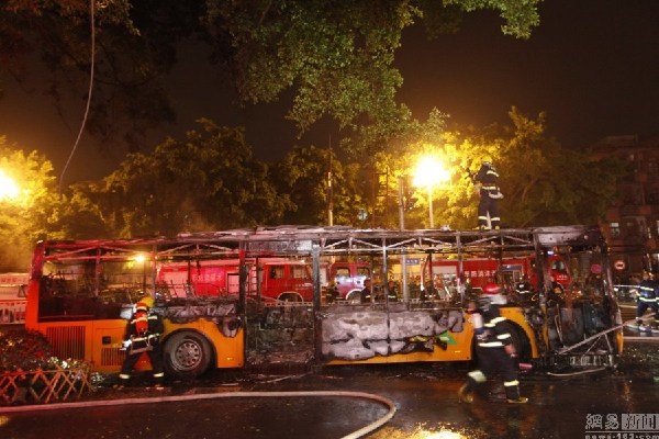 11月21日,广西柳州市屏山大道,起火的公交车几乎只剩骨架。CFP