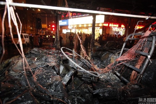 11月21日,广西柳州市屏山大道,起火的公交车几乎只剩骨架。CFP