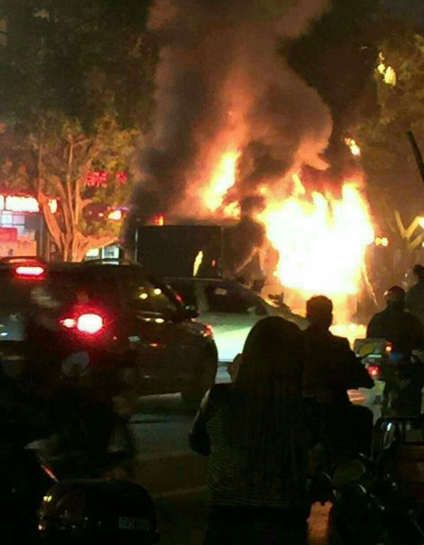 11月21日晚,柳州市屏山大道屏山小区附近路段,公交车起火现场。