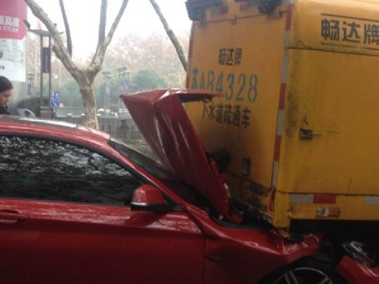 据江苏电视台新闻中心官方微博消息,11月25日9:20左右,南京中山北路紫峰大厦门口发生一起汽车追尾事故,一辆红色宝马跑车直接钻进了前方一辆汽车尾部,引擎盖被完全掀起。幸运的是女驾驶员丝毫未受伤,下车之后她说没有看到前方车辆的原因是自己开车睡着了。
