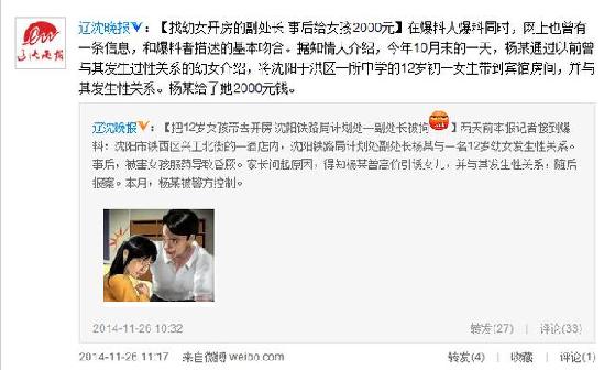 据辽沈晚报微博报道,两天前记者接到爆料:沈阳市铁西区兴工北街的一酒店内,沈阳铁路局计划处副处长杨某与一名12岁幼女发生性关系。事后,被害女孩服药导致昏厥。家长问起原因,得知杨某曾高价引诱女儿,并与其发生性关系,随后报案。本月,杨某被警方控制。
