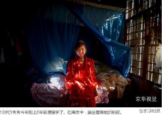 11月27日,云南金平县者米乡小翁寨村,13岁的秀秀和16岁的小听举行了婚礼。初中未毕业就辍学回家,结婚生子,这种现象在这里并不罕见。对此,金平县副县长普红芳并未回避,“现象有,但政府一直在努力做工作改变。”图片来源:京华时报官方微博