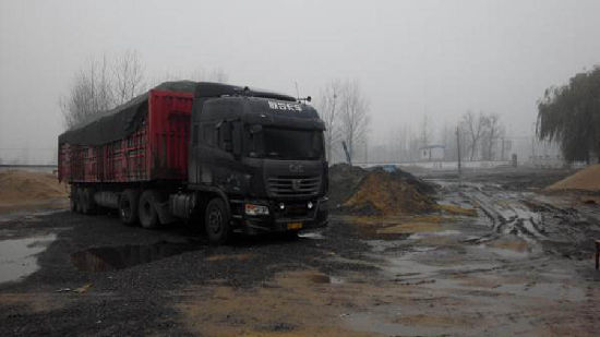 2014年11月24日14时25分左右,货车因超载被扣59天的车主张高兴在河南省民权县罗庄超限检测站辅道和妻子侯燕喝农药自杀。最终,张高兴在送医途中死亡,其妻经抢救脱离生命危险。图为张高兴停在罗庄超限站货场里的货车,扣押期间货车在超限站内车头内部莫名起火,因为起过火,车头玻璃发黑。