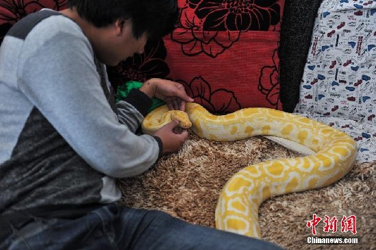 12月2日,白拓在昆明的家中查看蟒蛇身体状况。10年来家人朋友也慢慢接受了家里有蛇的生活。白拓现在在云南野生动物园工作,因工作关系,每次森警有查获贩卖蛇等野生动物后都会送到动物园,但由于动物园爬行动物馆设施不够完善,这些蛇都由他带回家照看,待条件允许后他会把这些蛇都送到动物园饲养。中新社发 任东 摄