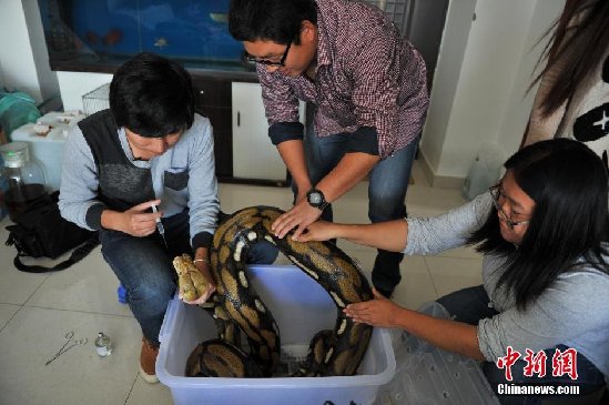 12月2日,白拓(左一)在昆明的家中给蟒蛇治疗口腔炎。中新社发 任东 摄