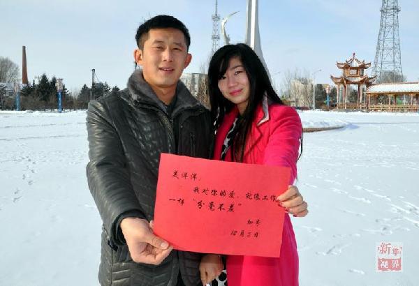 “90后”新婚夫妻孙佳浩(左)和张竟在黑龙江垦区建设农场的雪地里合影。他们都从事财会工作,于2014年11月步入婚姻的殿堂。(周良君摄)