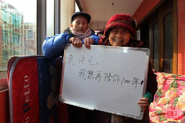 江苏如皋98岁老人姜培祖(左)与100岁的夫人姜召英从小青梅竹马。至今,两人已在一起生活约80年,家中已是四代同堂。(许丛军摄)