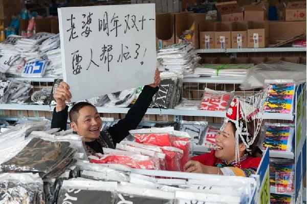 在浙江景宁畲族自治县,从事电子商务的“70后”丈夫雷青平在仓库内向妻子雷李娟请示。他们2006年结婚,现在景宁县从事电子商务工作,日子过得越来越红火。(李肃人摄)