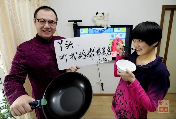 卢宇梁(左)和妻子刘鹤同为1983年生人,卢宇梁在辽宁省青年宫担任快板教师,两人因快板结缘,于2009年结婚。小两口以“小熊”“丫头”互称。(张文魁摄)来源:新华网