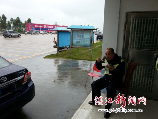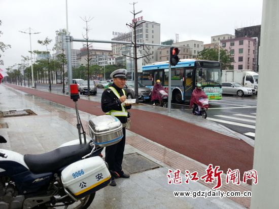霞山交警七日在海湾大桥桥头吃午饭不忘观察路面情况