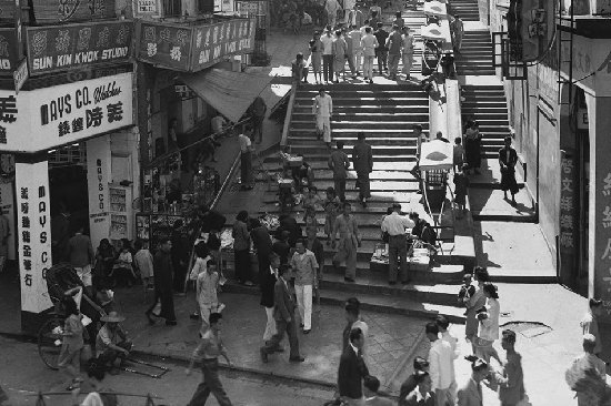 香港中环砵甸乍街上,匆匆的行人和售卖商品的小贩。这条街又叫石板街,为纪念香港首任总督砵甸乍爵士而得名,总是充满怀旧的气息。摄影/Hedda Morrison