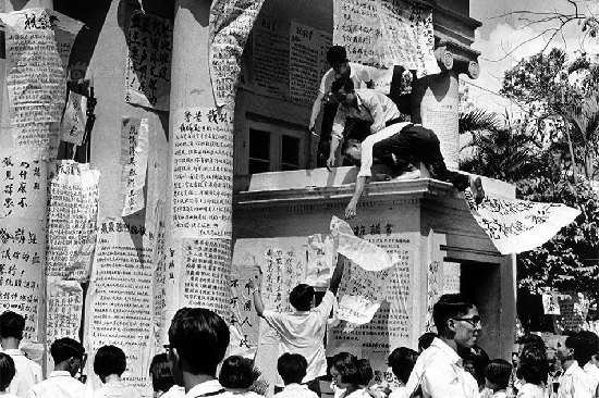1967年5月,香港左派在文革的影响下,展开对抗港英政府的暴动。图为左派人士与罢工工人到中环一带示威高呼口号,在港督府门外大举张贴大字报。