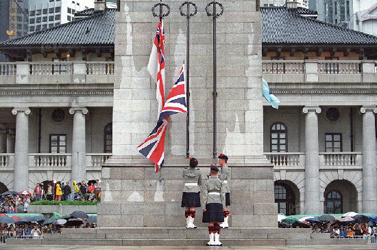 1997年6月30日黄昏,中环香港和平纪念碑前,英国国旗降下。在香港主权移交前,香港义勇军每日早上8时及下午6时在和平纪念碑进行升降旗仪式。1997年,升降旗任务改为英军黑卫士兵团负责。7月1日以后,香港岛上飘扬的,将是中华人民共和国国旗。