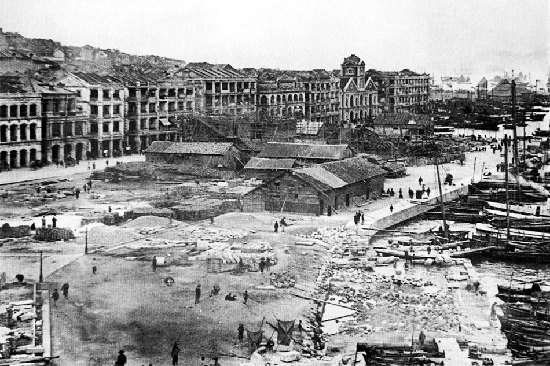 早期,中环地区大多是渔村,多岩石和斜坡。1851,太平天国起义爆发,很多广州人逃难到香港。土地无法满足激增的人口,于是中环地区开始填海造陆。图为1890年,香港中环进行填海时的情景。图中的堤岸,即今干诺道中。