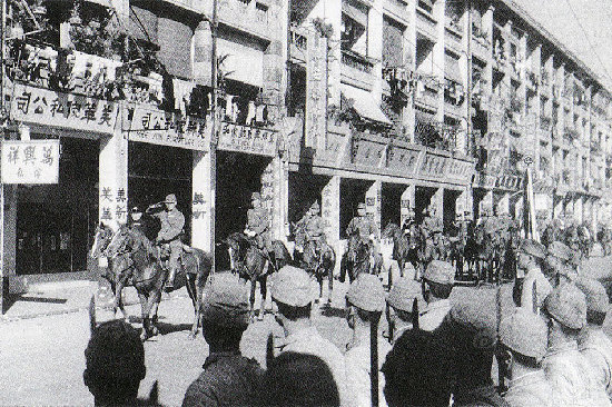 上世纪30年代,中国开始抗日战争,香港成为文化人的避风港,在这里进行抗日救亡活动。中环皇后大道中18号即为八路军驻香港办事处。1941年12月25日,经过一番抵抗之后,香港总督杨慕琦向日本投降,香港沦陷。图为日军占领香港后在皇后大道中举行入城式。