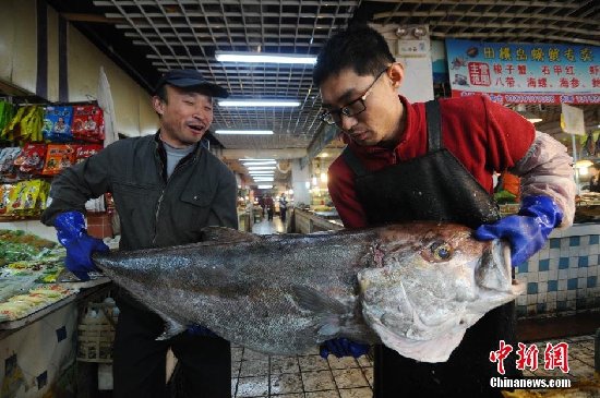 12月14日,一条长1.46米,重100余斤的“怪鱼”被摆上青岛市一家野生鱼专卖店摊档,很多市民围观这条“怪鱼”却无人认识,连多年从事捕鱼的渔民也叫不上名字。据了解,12日凌晨,胶州渔民在渤海湾收网时捕获到这条大鱼,同时还捕获到一条罕见的重约20斤的鸦片鱼。由于不知大鱼的名字,也无法定价,目前这条大鱼仍“暂存”在这家野生鱼专卖店里。中新社发 王海滨 摄 图片来源:CNSPHOTO