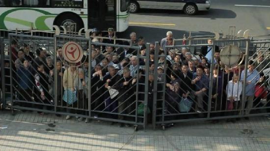 2014年12月18日报道,两名外国人Jonathan Meador和Jonathon Lim从14楼高层阳台拍摄了上海一家超市门口大批老人开门后蜂拥挤进超市的场景。图为超市开门前,老人们拥挤在大门口。