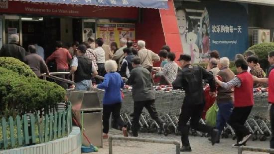 2014年12月18日报道,两名外国人Jonathan Meador和Jonathon Lim从14楼高层阳台拍摄了上海一家超市门口大批老人开门后蜂拥挤进超市的场景。图为老人们争先恐后向超市奔跑,腿脚不输年轻人。