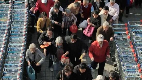 2014年12月18日报道,两名外国人Jonathan Meador和Jonathon Lim从14楼高层阳台拍摄了上海一家超市门口大批老人开门后蜂拥挤进超市的场景。图为老人们你追我赶,蜂拥而入。