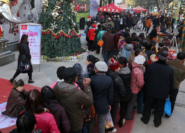 2014年12月23日,郑州二七路一珠宝广场,200多位市民排起了数十米长队,拿着苹果等待换黄金。据介绍,为了迎圣诞节,凡持一对苹果到金鑫珠宝正弘店,即可免费兑换迷你“招财金”小金条一个。