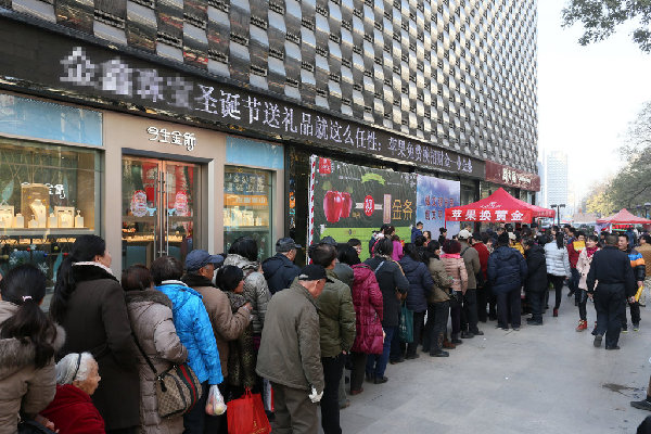 郑州一企业迎圣诞用苹果换黄金 市民排数十米长龙