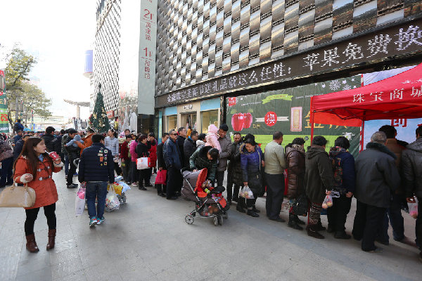 郑州一企业迎圣诞用苹果换黄金 市民排数十米长龙